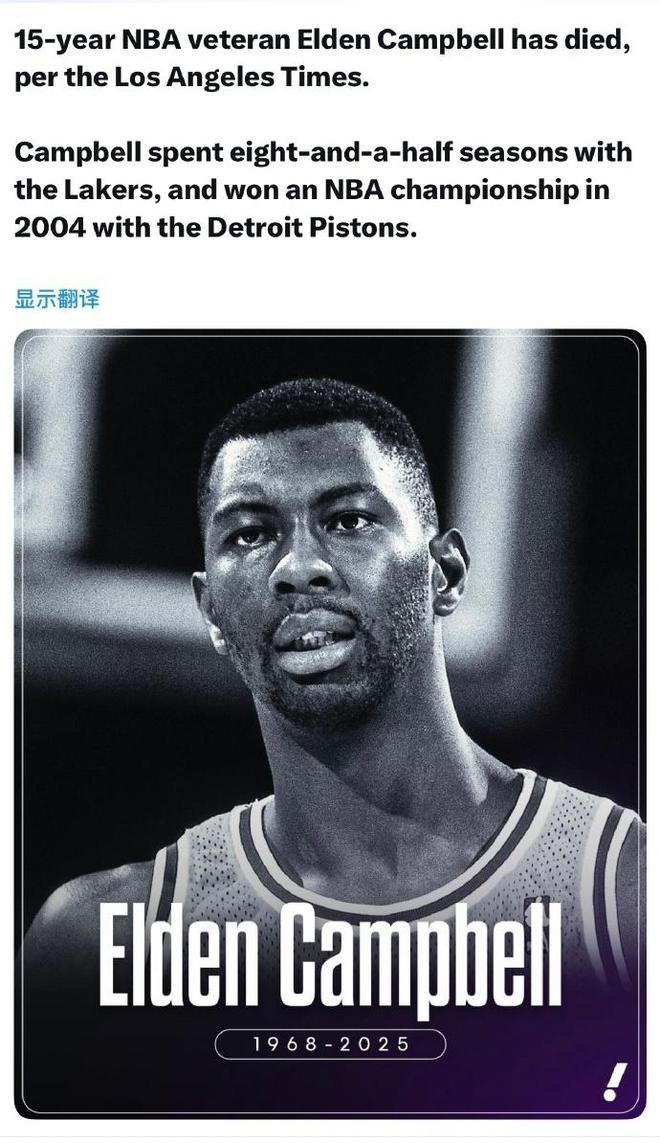 根据美媒《洛杉矶时报》报道,前NBA总冠军中锋埃尔登-坎贝尔于当地时间 12月2日去世,享年57岁,他的死因目前尚未对外公布。埃尔登-坎贝尔效力NBA15个赛季,其中效力湖人8个半赛季,在2004年跟随活塞夺冠。